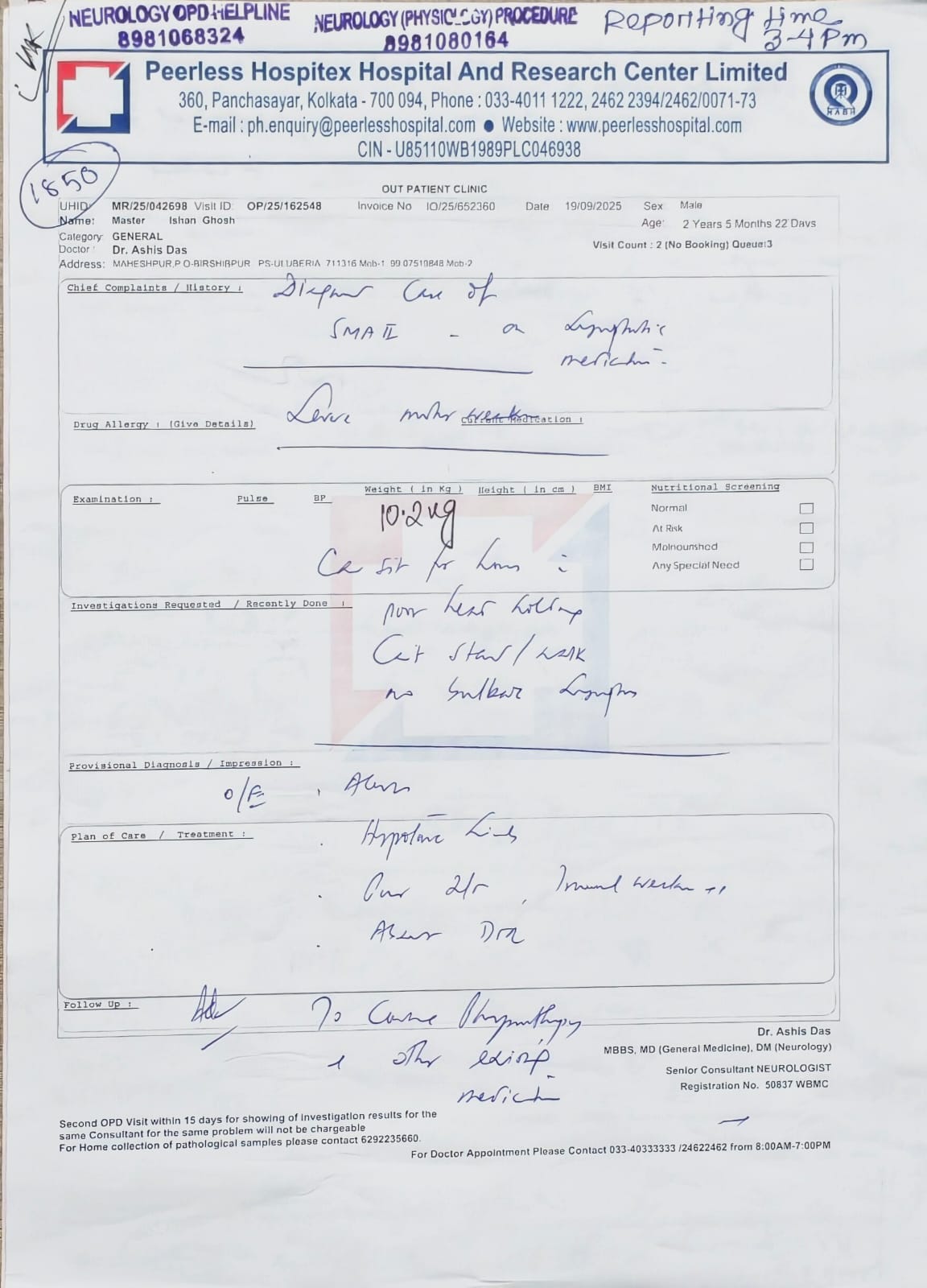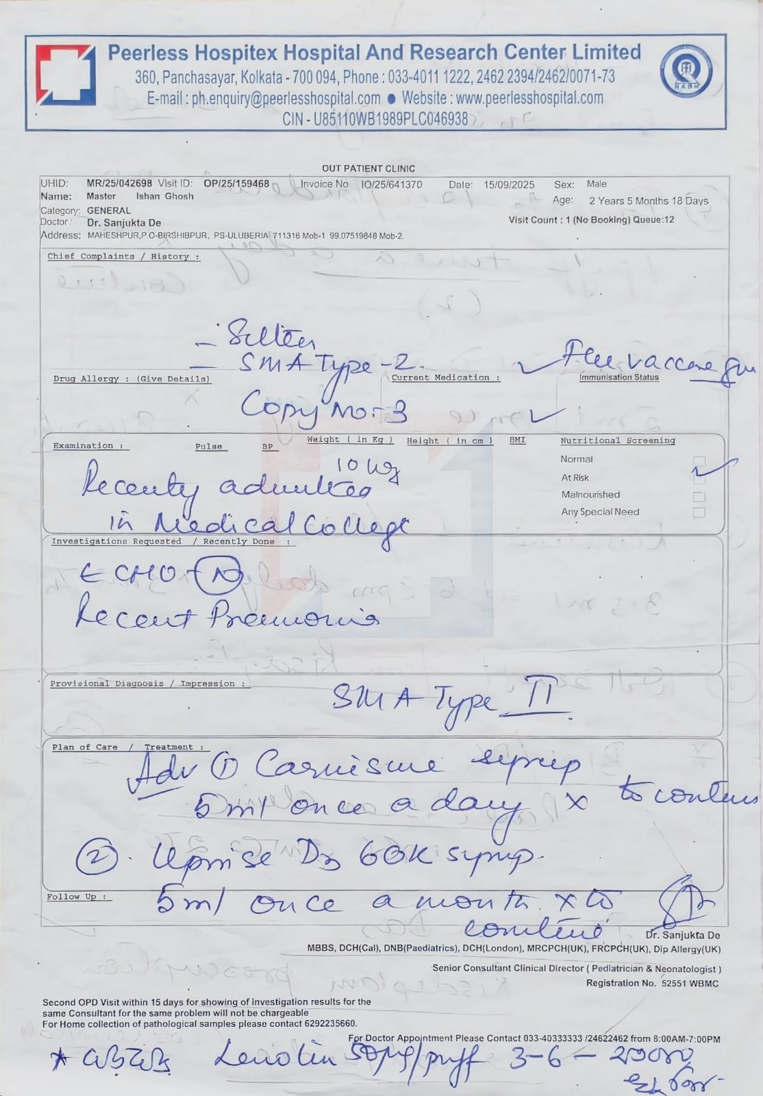 SMA Type 2 is a genetic neuromuscular disorder caused by the survival motor neuron gene (SMN1) mutation. Because of this mutation, the body does not produce enough SMN protein, which is essential for motor neurons. Without it, the nerves controlling movement weaken over time. 👶 Who Gets SMA Type 2? Symptoms usually appear between 6–18 months of age. Children with SMA Type 2 can sit without support, but cannot stand or walk independently. 🧠Causes Mutation or deletion in the SMN1 gene. Inherited in an autosomal recessive pattern (both parents carry the gene). 🩺 Symptoms Motor Symptoms Muscle weakness (especially legs) Trouble standing or walking Tremors (especially in hands) Scoliosis (curved spine) Joint problems (contractures) Difficulty lifting arms above shoulders Other Symptoms Breathing weakness (mild to moderate) Difficulty coughing out mucus Swallowing issues (sometimes) Fatigue during physical activity 🧪 Diagnosis Doctors confirm SMA Type 2 using: Genetic testing (SMN1 gene study) EMG (electromyography) Muscle function assessments CK (creatine kinase) levels (sometimes slightly elevated) 💊 Treatment Options (Modern & Effective) While SMA has no cure, new treatments significantly improve strength and lifespan. 1. Spinraza (Nusinersen) First FDA-approved SMA drug Delivered by spinal injection Increases SMN protein production 2. Zolgensma (Gene Therapy) One-time IV gene therapy Replaces faulty SMN1 gene Mostly for infants under 2 years 3. Evrysdi (Risdiplam) Daily oral medicine Increases SMN protein levels Approved for adults and children over 2 months 4. Supportive Therapies Physiotherapy Respiratory therapy Orthopedic support (braces, scoliosis treatment) Nutritional management 🧬 Life Expectancy With modern treatments, life expectancy for SMA Type 2 is near-normal. Most people: Live into adulthood Continue education and career Maintain independence with mobility aids 🧡 How It Affects Daily Life People with SMA Type 2 may use: Wheelchair for mobility Standing frames Bracing for spine Respiratory support during sleep But with therapy and medications, they can lead active, productive lives. 🧒 Prognosis Slow progression over years Early treatment improves motor function significantly New medicines greatly reduce complications